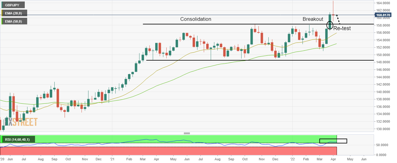 - GBP/JPY has recorded yearly highs at 164.64 after a nine-month consolidation breakout.