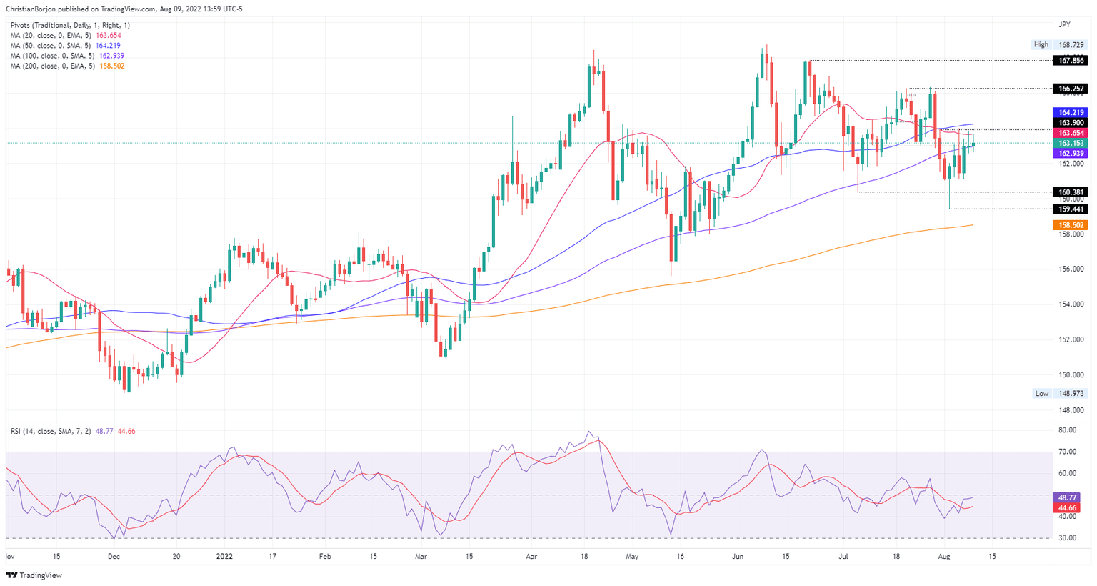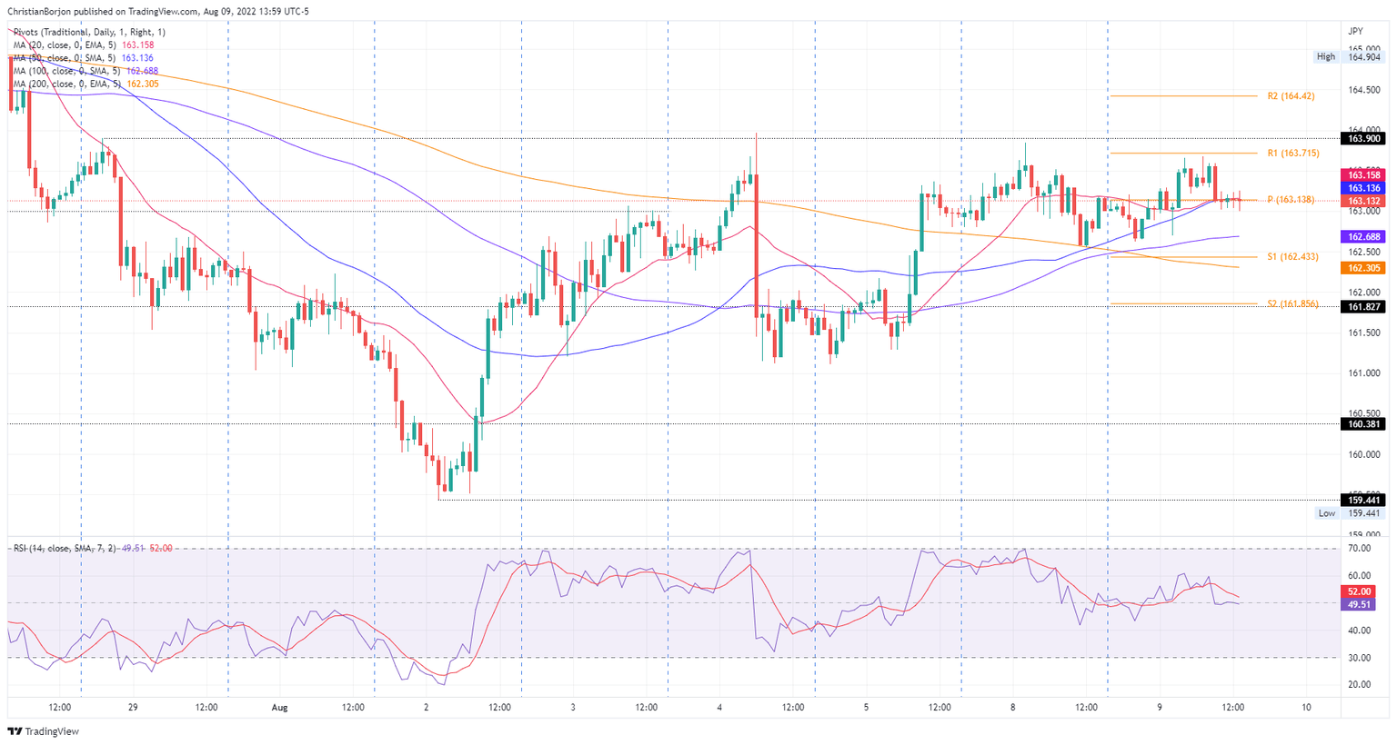 From a daily chart perspective, the GBP/JPY is neutral-biased. For the second straight day, buyers’ inability to breach the 20-day EMA at 136.64 increased selling pressure in the cross, with bears piling around the 163.60 area, pushing the exchange rate towards the 163.00 figure.