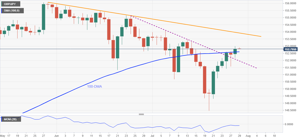 - GBP/JPY eases from two-week top, keeps breakout of 100-DMA, monthly falling trend line.