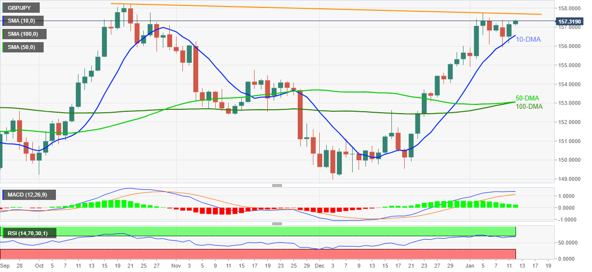 GBP/JPY refreshes weekly top to 157.41 while stretching the previous day’s rebound from 10-DMA to early Wednesday. In doing so, the cross-currency pair eyes a downward sloping resistance line from October 20.
