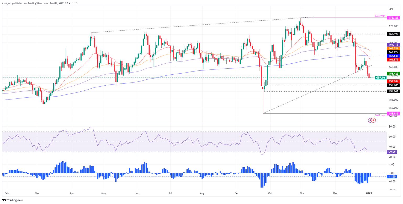 The GBP/JPY plunged more than 100 pips on Monday, extending its losses to three consecutive days, once price action dived below the 200-day Exponential Moving Average (EMA). Furthermore, the cross of the 20-day EMA beneath the 200-day EMA exacerbated the acceleration of the downtrend, as the GBP/JPY gets poised to fall toward the 155.00 mark. At the time of writing, the GBP/JPY is trading at 157.46, below its opening price by 0.69%.