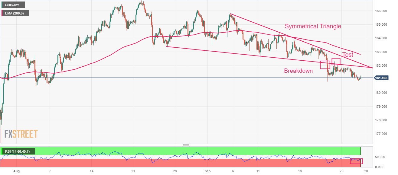 The GBP/JPY pair discovers some buying interest near 181.00 after remaining under selling pressure from the past few trading sessions. The asset may continue its downside trend the policy divergence between the Bank of England (BoE) and the Bank of Japan (BoJ) would not widen further on expectations that the former is done with hiking interest rates.