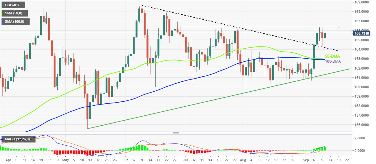 Not only the key resistance breakout but the bullish MACD signals also favor GBP/JPY bulls to portray another run-up towards crossing a 10-week-old horizontal resistance area surrounding 166.30.