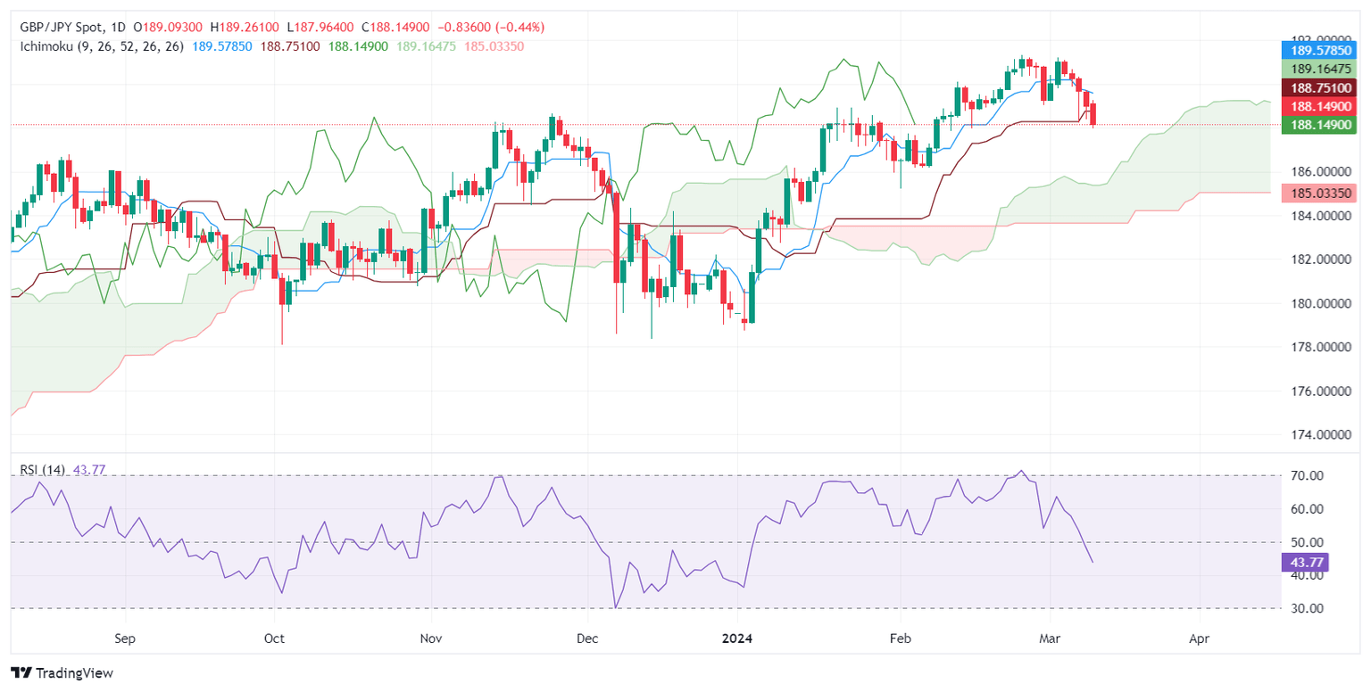 The GBP/JPY clings to the 188.00 figure and prints losses of 0.51% in the mid-North American session. The pair exchanges hands at 188.04 after dropping from a daily high of 189.17.