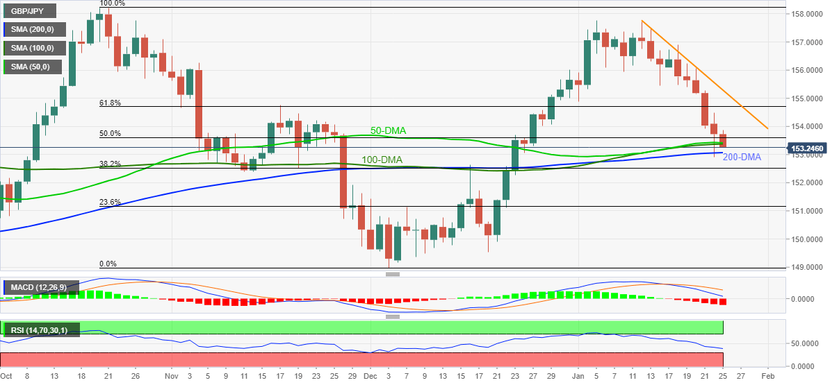 GBP/JPY takes offers around 153.30, down 0.27% intraday to portray six-day declines during early Tuesday.