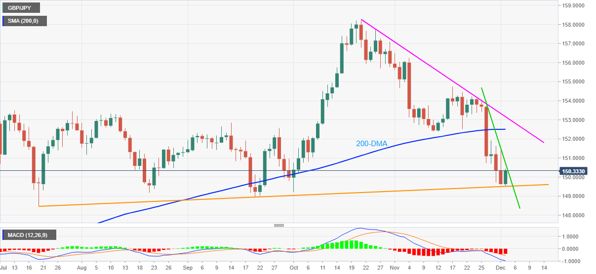 Even so, a one-week-old resistance line joins bearish MACD signals to keep sellers hopeful until the quote crosses the 150.75 level.
