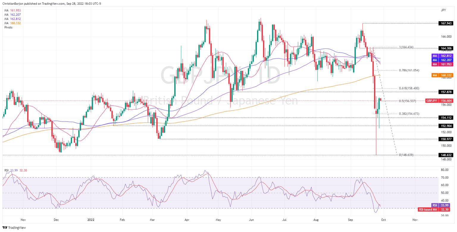 - However, if the GBP/JPY fails to reclaim 157.00, that would pave the way for sellers, and the pair could drop towards the 38.2% Fibonacci retracement at 154.67.