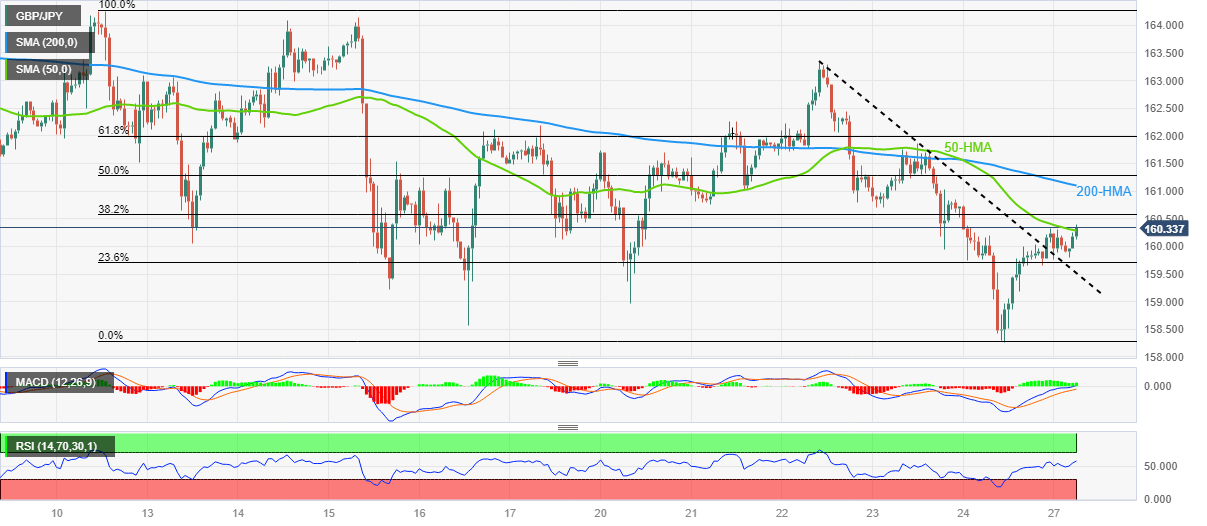 GBP/JPY renews intraday high near 160.35 as bulls return to the table amid early Monday in London, after a three-day absence. In doing so, the quote pierces 50-Hour Moving Average (HMA) in an attempt to please the buyers.