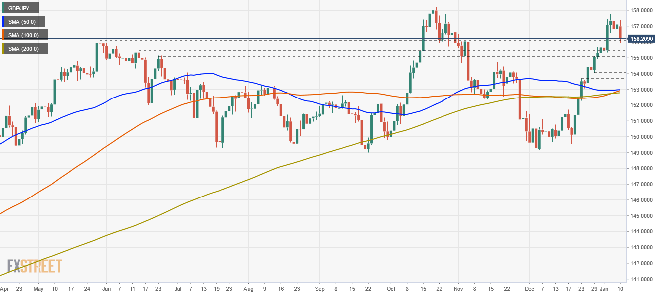 The GBP/JPY pair is upward biased. The daily moving averages (DMAs) reside below the spot price, but the high reached on January 5 at 157.76, short of October 20, 2021, daily high at 158.22, exposed the pair to downward pressure, leaving it at the mercy of the market mood.