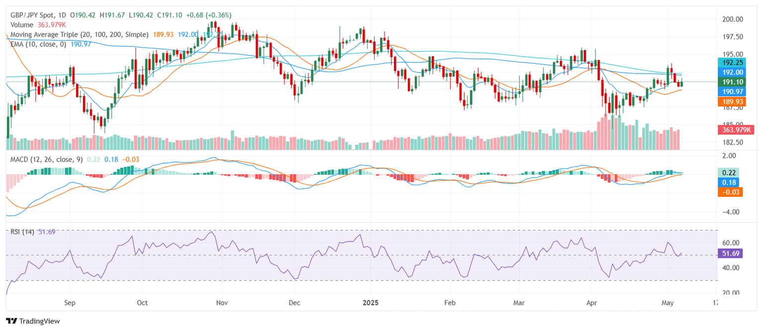 The GBP/JPY pair edged higher on Wednesday, trading around the 191.00 zone as buyers maintained control. The pair remains supported by a series of rising short-term moving averages, reinforcing the broader bullish structure despite some mixed momentum signals that may limit immediate upside potential.