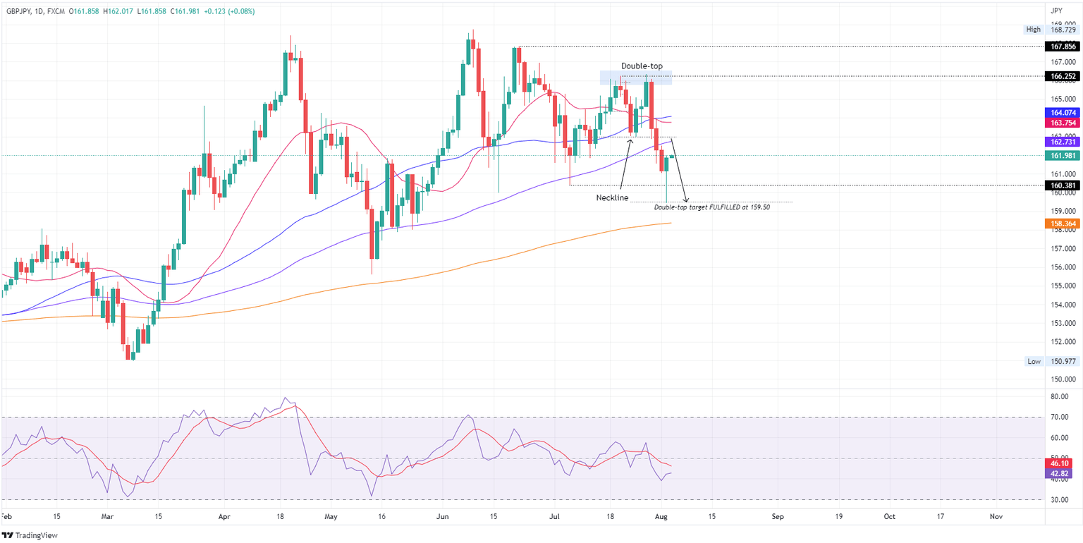 The GBP/JPY rallied after touching the double-top target and the daily low at around 159.44, then hitting a daily high at 162.00 before retracing to current price levels. At the time of writing, the GBP/JPY is trading at 161.99 as the Asian session begins.