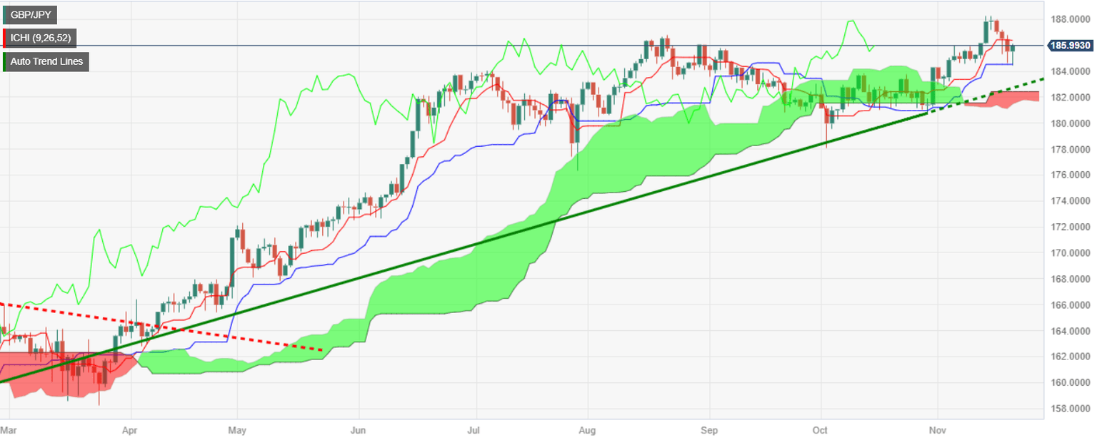 GBP/JPY snaps four days of losses, climbs 0.31% in the late Tuesday North American session, and exchanges hands at around 186.00 after bouncing from daily/weekly lows reached at 184.45.