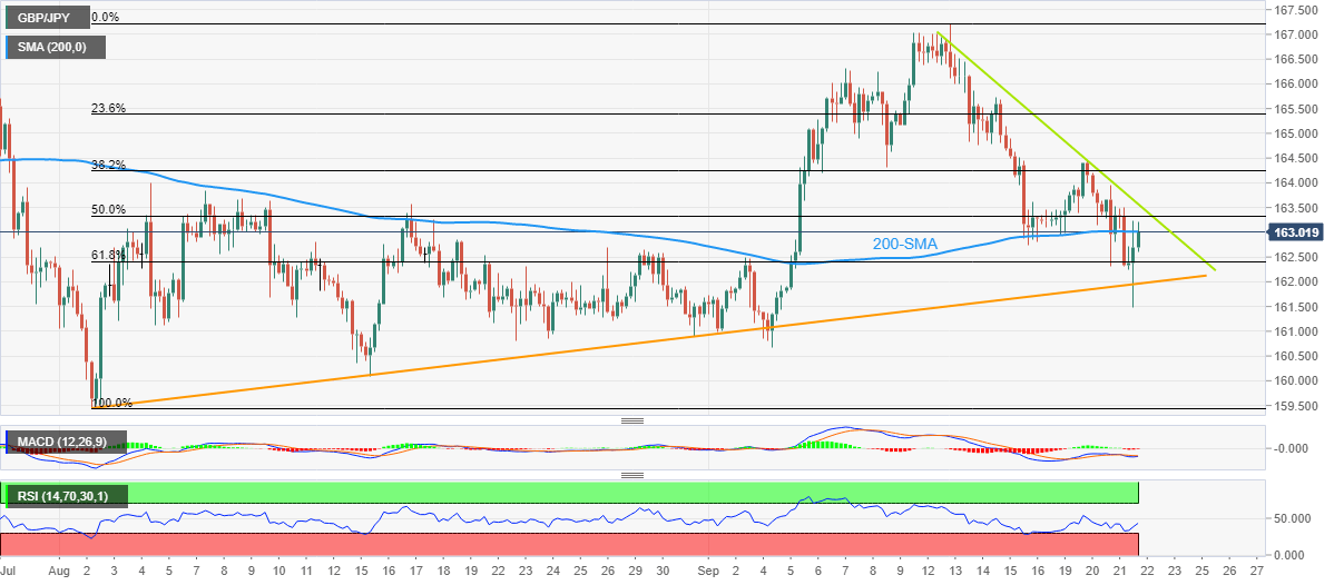 In addition to the 200-SMA level of 163.10, the downward sloping resistance line from September 13, around 163.60, also challenges the pair buyers.