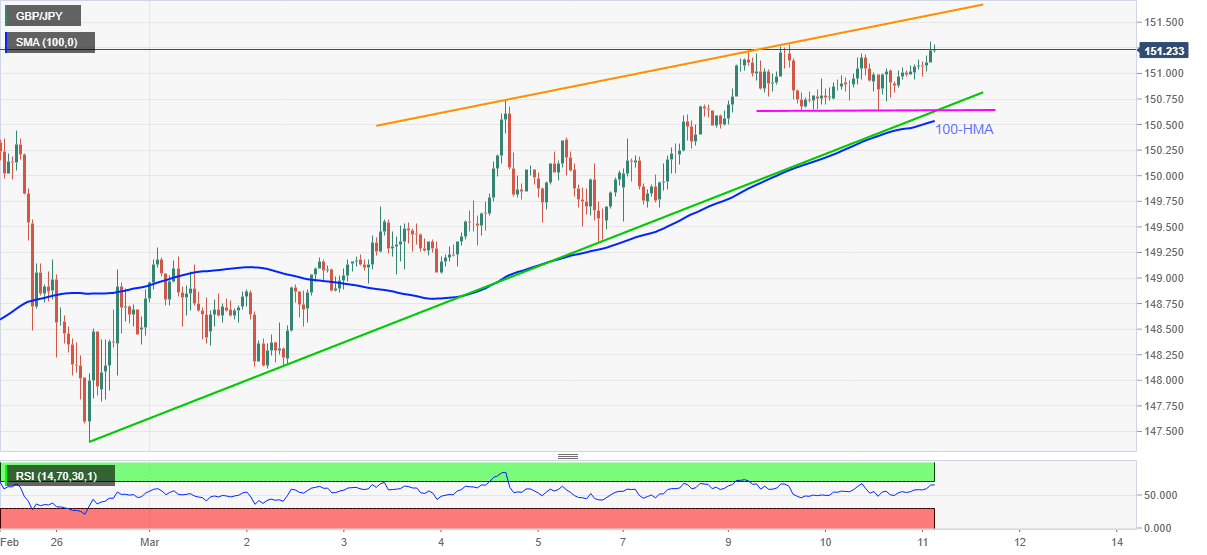 GBP/JPY extends upward trajectory to the fresh high in 34.5 months, up 0.17% intraday near 151.31, during early Thursday. Although the pair rises for the ninth consecutive day, the RSI still has room to the north before hitting the overbought signal.