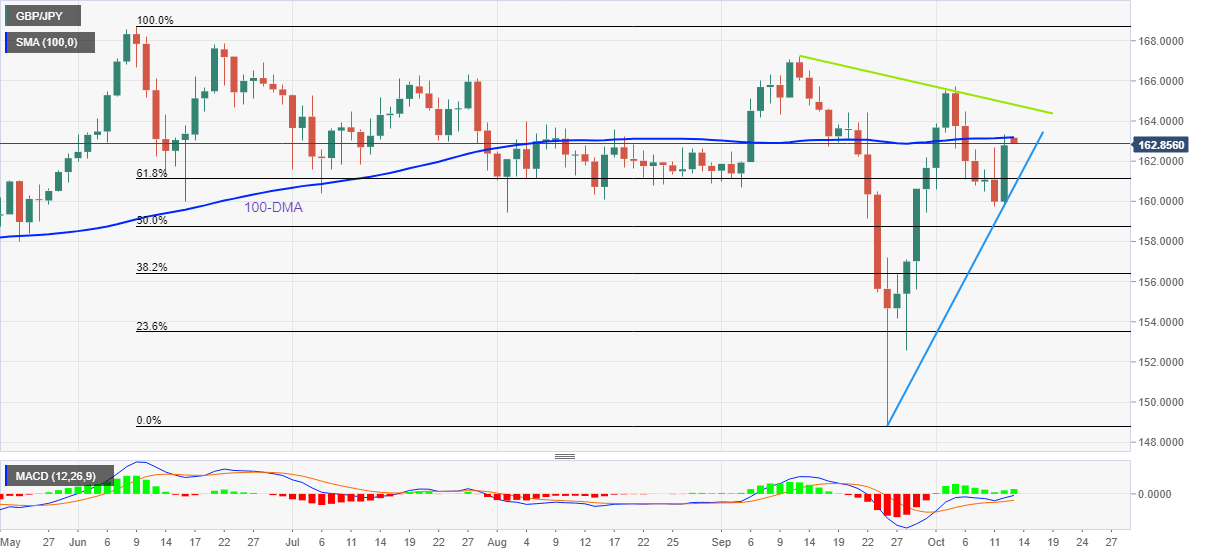 In doing so, the cross-currency pair reverses from the 100-DMA but stays above the key Fibonacci retracement level of the quote’s June-September moves, as well as an important support line stretched from September 26, amid bullish MACD signals.