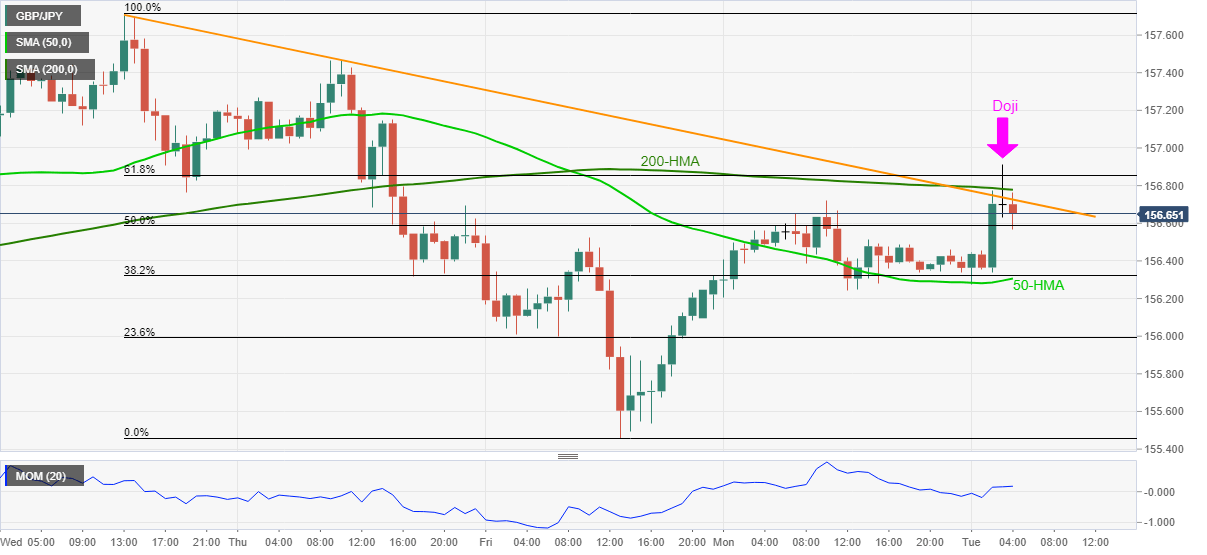 GBP/JPY remains on the back foot around 156.60, paring intraday gains with the latest U-turn from 156.91 during early Tuesday morning in London.