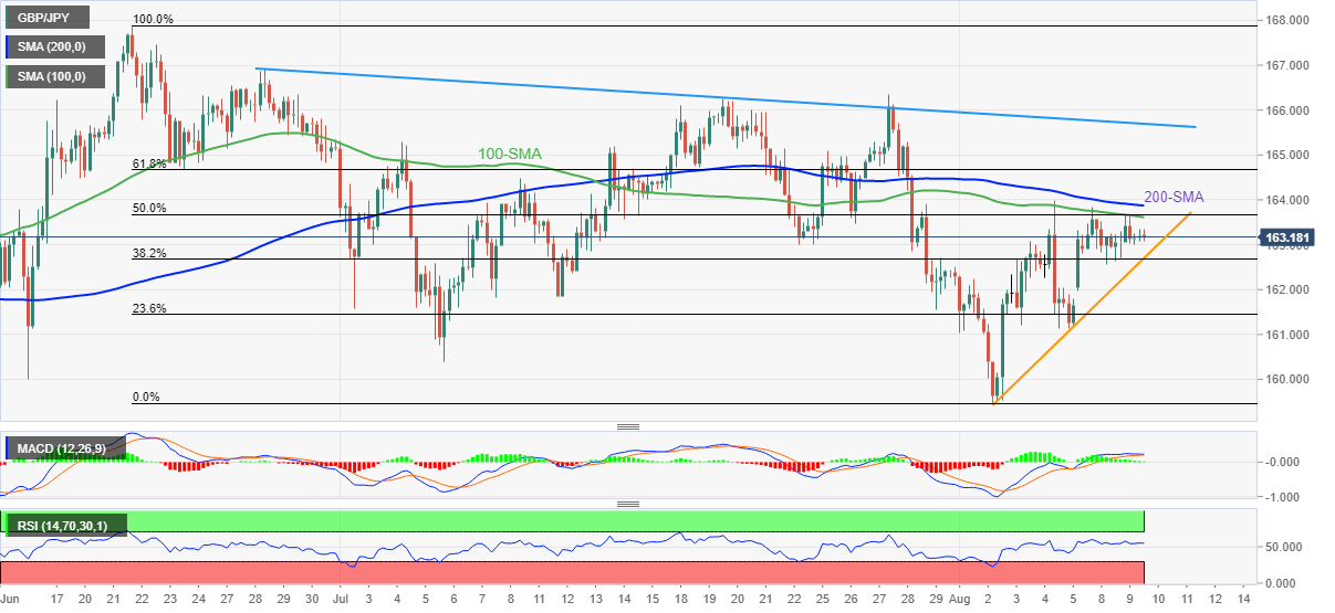On the contrary, a convergence of the 100-SMA and the 50% Fibonacci retracement of the June-August downside, near 163.60 restricts the immediate upside of the GBP/JPY pair.