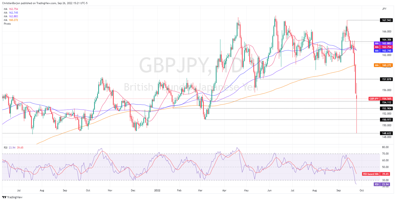 From a daily chart perspective, the GBP/JPY shifted bearish biased once sellers hurdled the 200-day EMA, which, at the time of typing, stands at 160.27, opening the door for further losses. GBP/JPY traders should be aware that the Relative Strength Index (RSI) plunged to oversold levels at 24, which could impede sellers from taking action. Indeed, once the RSI exits from those levels, traders should expect a resumption of the downtrend, targeting the fresh YTD low at 148.53, which could extend towards the September 2020 cycle high of 142.70.