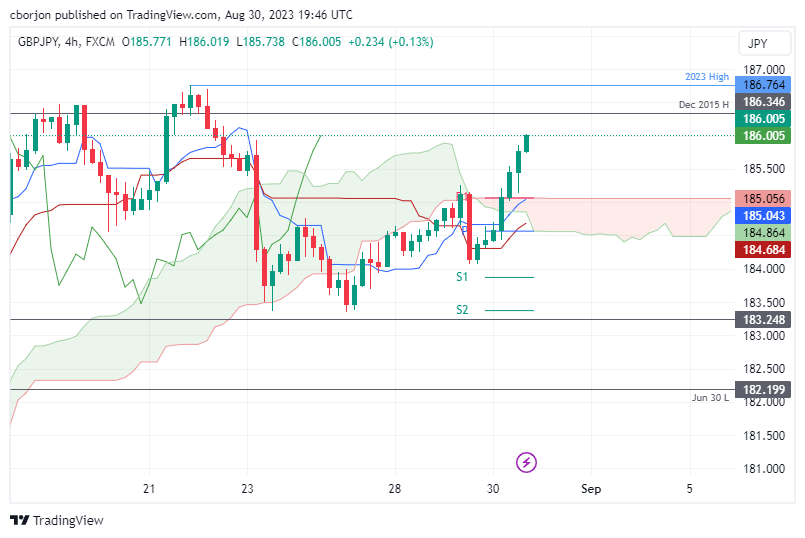 The GBP/JPY rallied sharply on Wednesday, gaining more than 150 pips or 0.88%, as market sentiment remains upbeat, following the release of US economic data that could deter the US central bank from hiking rates. The pair is trading at 185.90 after hitting a daily low of 184.31.