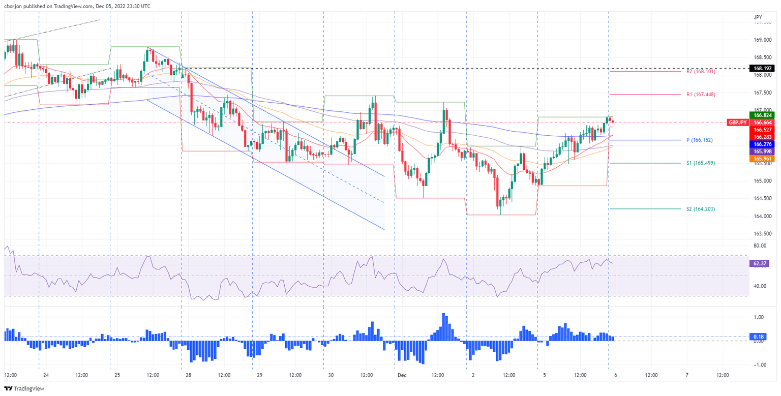 The GBP/JPY snaps two days of consecutive losses and breaches the 100, 50, and 20-day Exponential Moving Averages (EMAs), rallying more than 170 pips on Monday. In the meantime, the GBP/JPY is trading at 166.68 as the Asian Pacific session begins, registering minuscule losses of 0.07%.