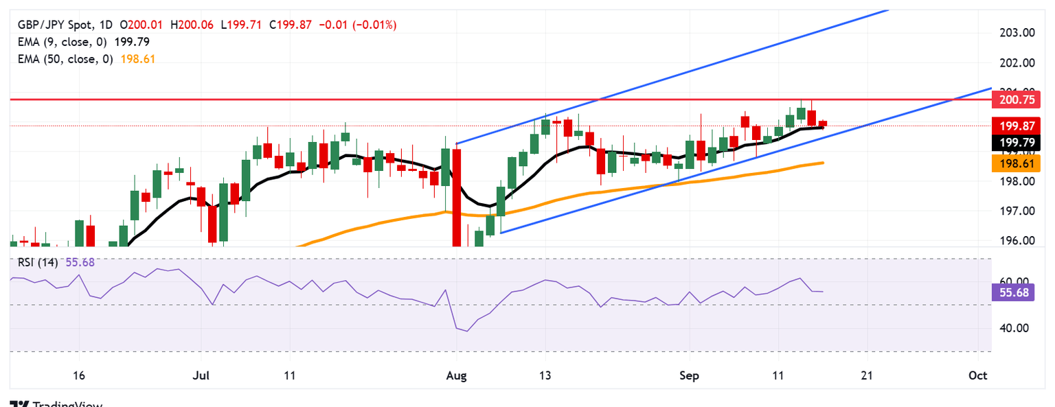 On the upside, the GBP/JPY cross is testing its immediate barrier at the psychological level of 200.00, followed by the 200.75, the highest since July 2024, which was reached on September 15. A break above this level could lead the currency cross to explore the region around the ascending channel’s upper boundary at 203.10.