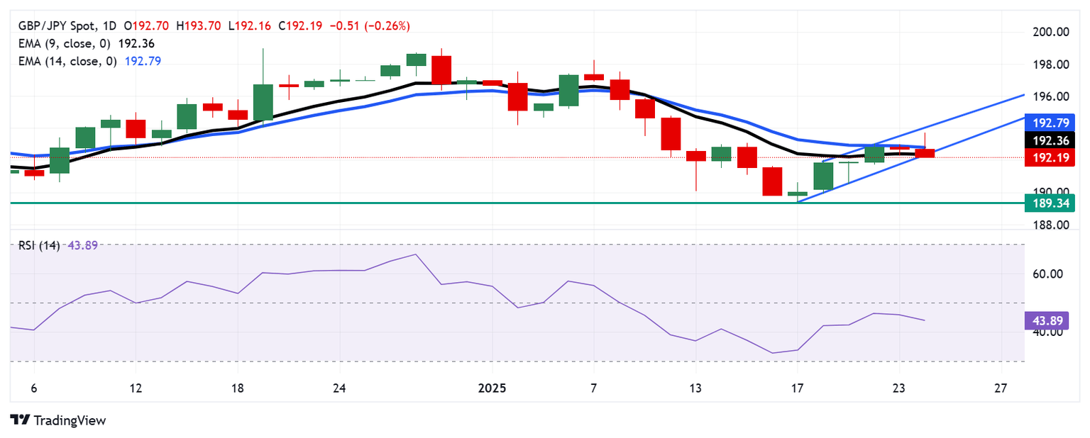 The GBP/JPY cross faces primary resistance at the 9-day EMA at 192.36, followed by the 14-day EMA at 192.79. A move above the latter could boost short-term price momentum, supporting the currency cross to test the upper boundary of the ascending channel at the 194.00 level.