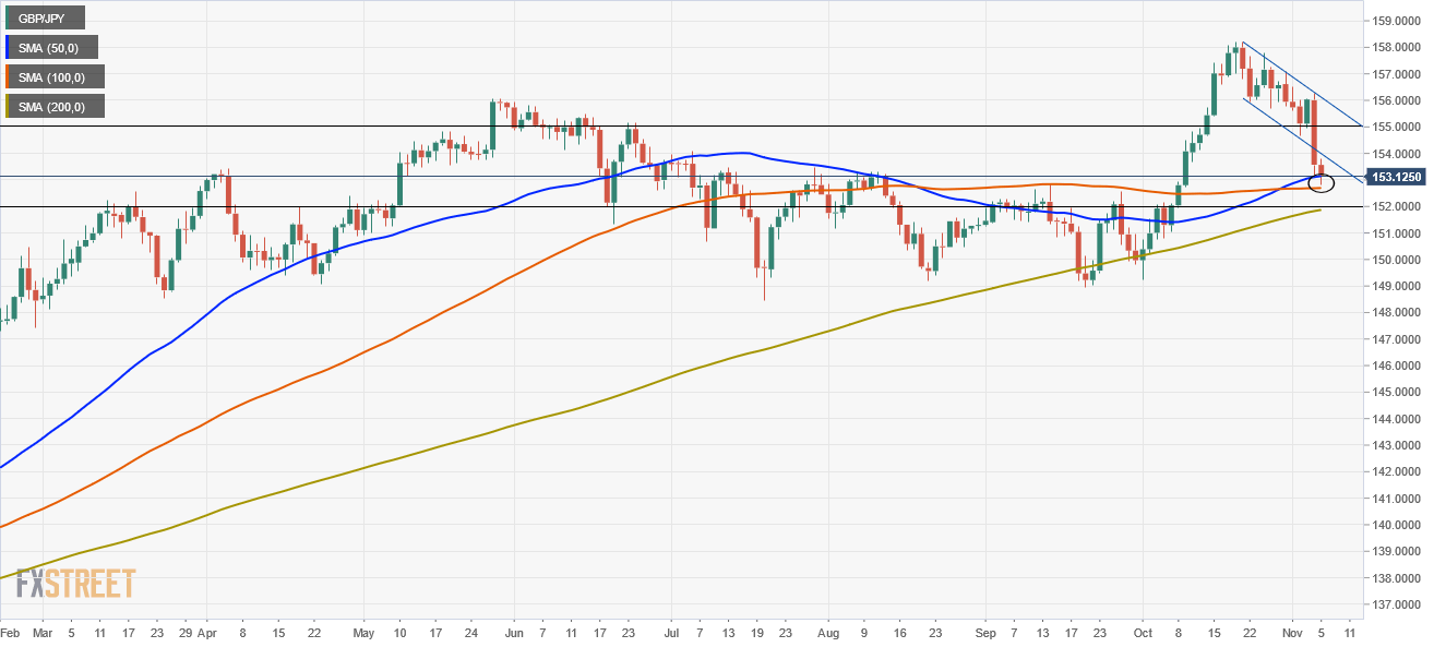 The GBP/JPY Friday’s price action witnessed the pair breaking the 50-day moving average (DMA) to the downside, as the 50-DMA sits at 153.14, leaving GBP bulls at risk. The positive out of the drop in the day is that the 100-DMA was not at risk, but if the GBP/JPY selling pressure continues to mount, it could be broken, exposing the 152.00 psychological support level.