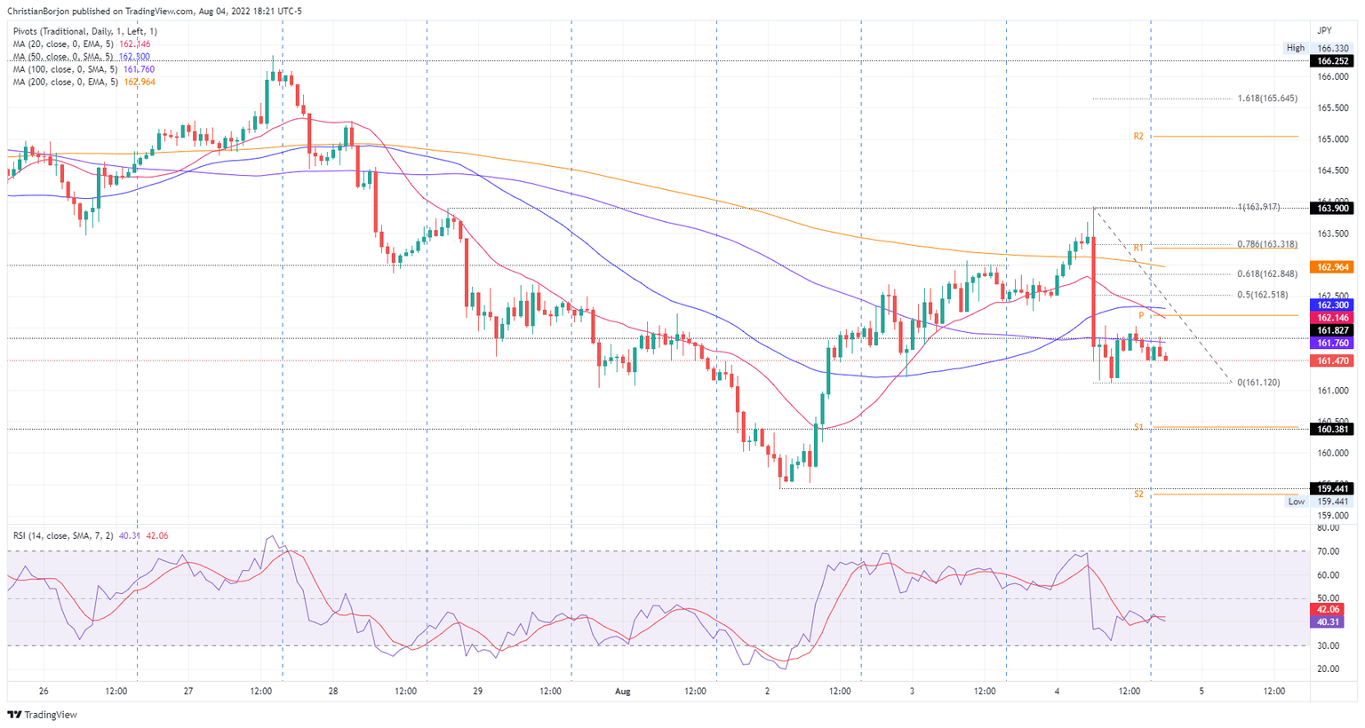 Unless the GBP/JPY decisively breaks below the August 4 low at 161.12, a pullback towards the 100-day EMA at 162.83 is on the cards.