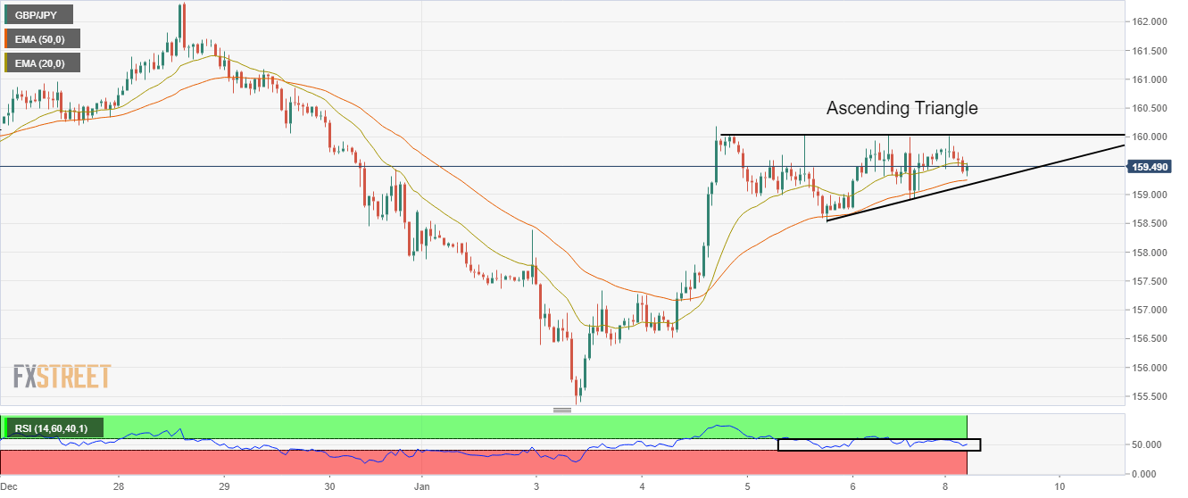 On an hourly scale, the cross is auctioning in an Ascending Triangle chart pattern that signals a volatility contraction. Usually, a volatility contraction is followed by a breakout, which results in wider ticks and heavy volume. The horizontal resistance of the aforementioned chart pattern is plotted from January 4 high around 160.20 while the upward-sloping trendline is placed from January 5 low at 158.52.