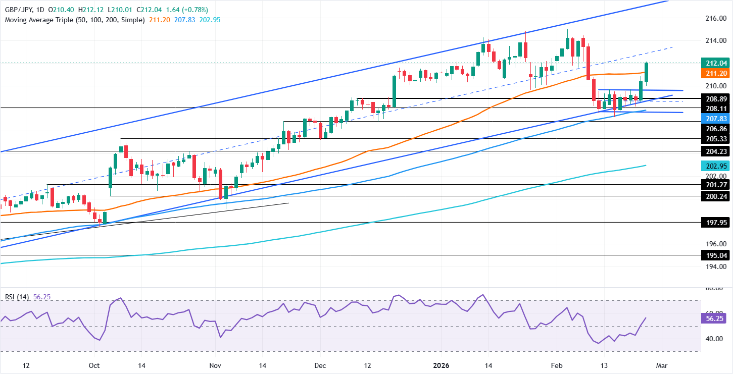 The GBP/JPY rallies for the second straight day, up by over 0.80% as Yen weakness extends, as the Japanese Prime Minister Takaichi nominates two slightly “dovish” academics to the Bank of Japan’s board. The cross trades at 211.94, slightly below the day’s high of 212.12.