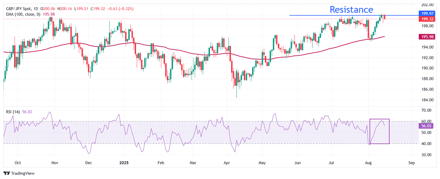 GBP/JPY continues to face selling pressure near the psychological level of 200.00. However, the near-term trend of the cross remains bullish as the 100-day Exponential Moving Average (EMA) slopes higher around 195.95.