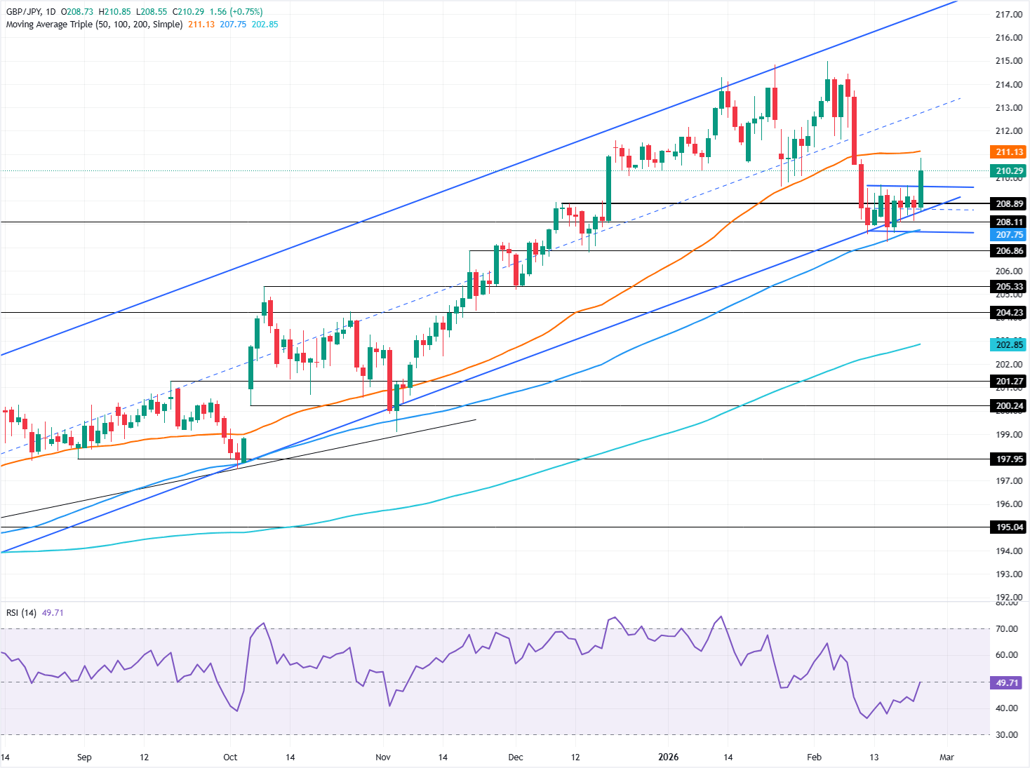 The Pound Sterling advances versus the Japanese Yen, in the aftermath of comments that the Japanese PM Takaichi expressed her concerns about additional rate hikes to Bank of Japan Governor Kazuo Ueda, as the central bank seems poised to resume its normalization of monetary policy. At the time of writing, the GBP/JPY trades at 210.34, posting gains of over 0.80%.