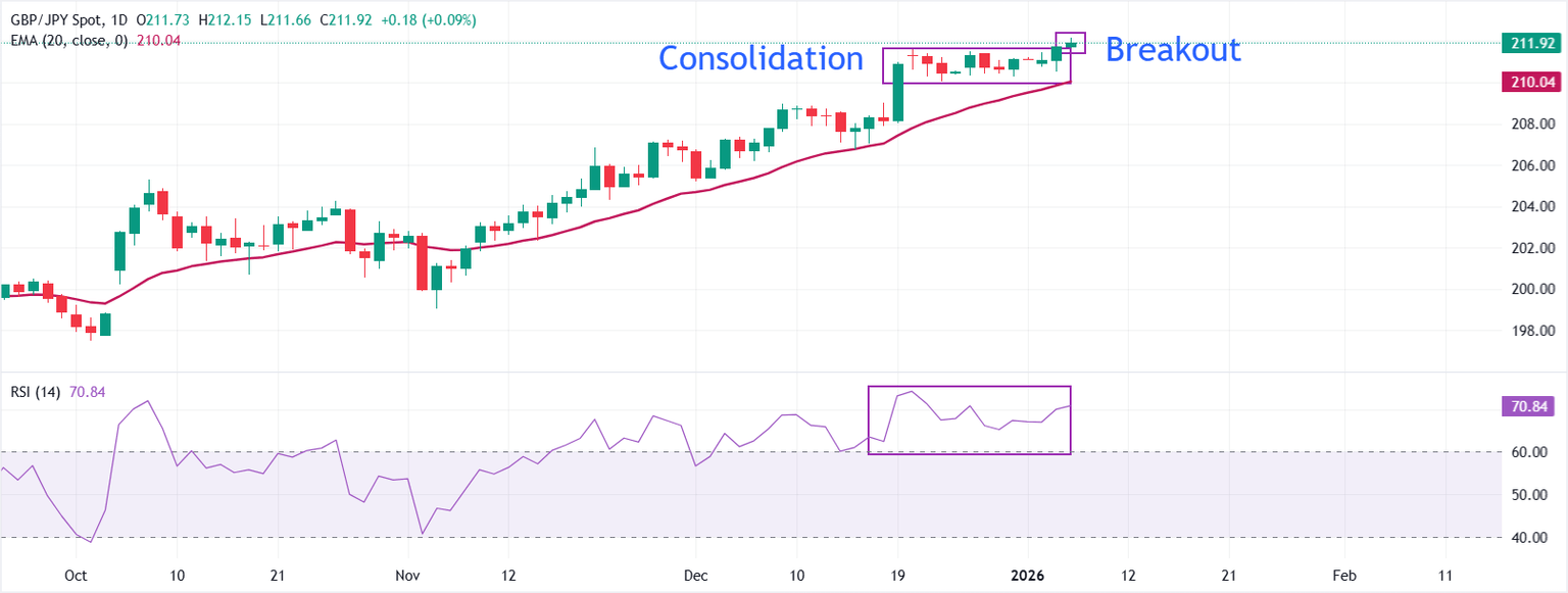 In the daily chart, GBP/JPY trades at 211.92 as of writing. The 20-day Exponential Moving Average (EMA) rises and provides support at 210.04. Price holds above this rising gauge, preserving the bullish bias.