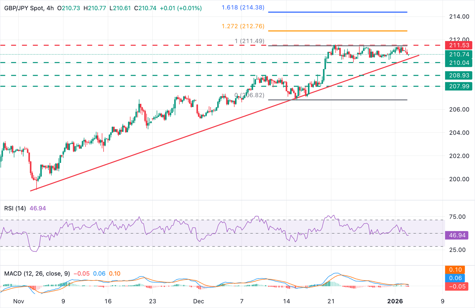 In the 4-hour chart, GBP/JPY trades at 210.88, posting moderate losses on the daily chart after rejection at the 211.50 area on Friday.