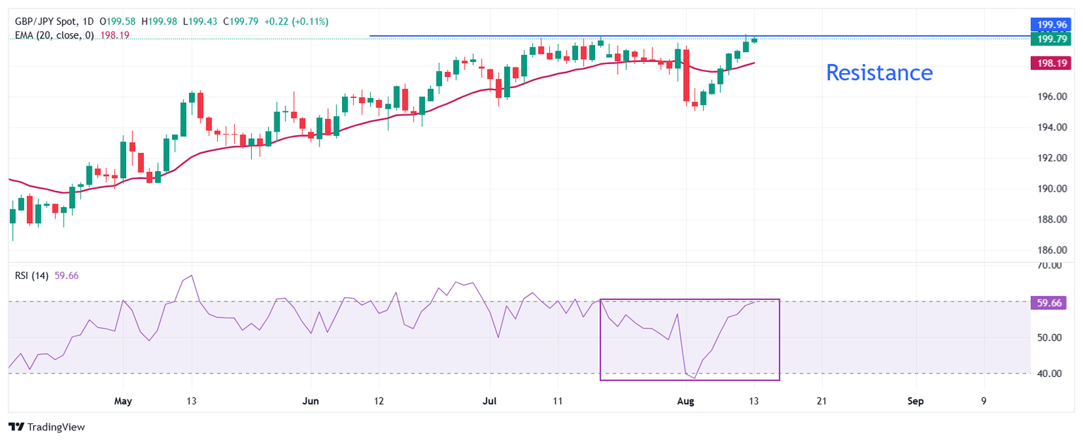 GBP/JPY extends its over-a-week long recovery move from 195.00 to near 200.00. The near-term trend of the cross is bullish as it holds above the 20-day Exponential Moving Average (EMA), which trades around 198.18.