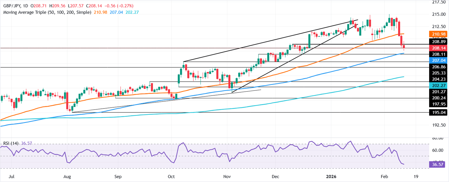 The Pound Sterling tumbles on Thursday, down 0.36% in the day as risk aversion boosted the safe-haven appeal of the Japanese Yen. Renewed AI disruption fears sent Wall Street plunging, while haven assets like Gold, Silver and the US Dollar failed to gain traction. At the time of writing, the GBP/JPY trades at 209.09 after hitting a daily high fo 209.55.