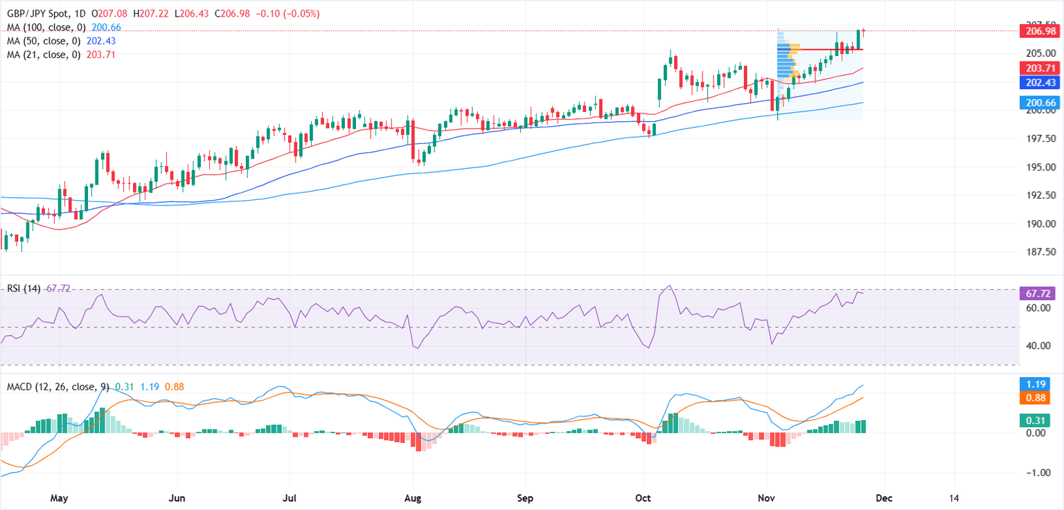 GBP/JPY holds steady near 207.00 on Thursday after touching a fresh year-to-date high on the previous day, with sentiment leaning in favour of the British Pound (GBP) following the United Kingdom’s Autumn Budget.