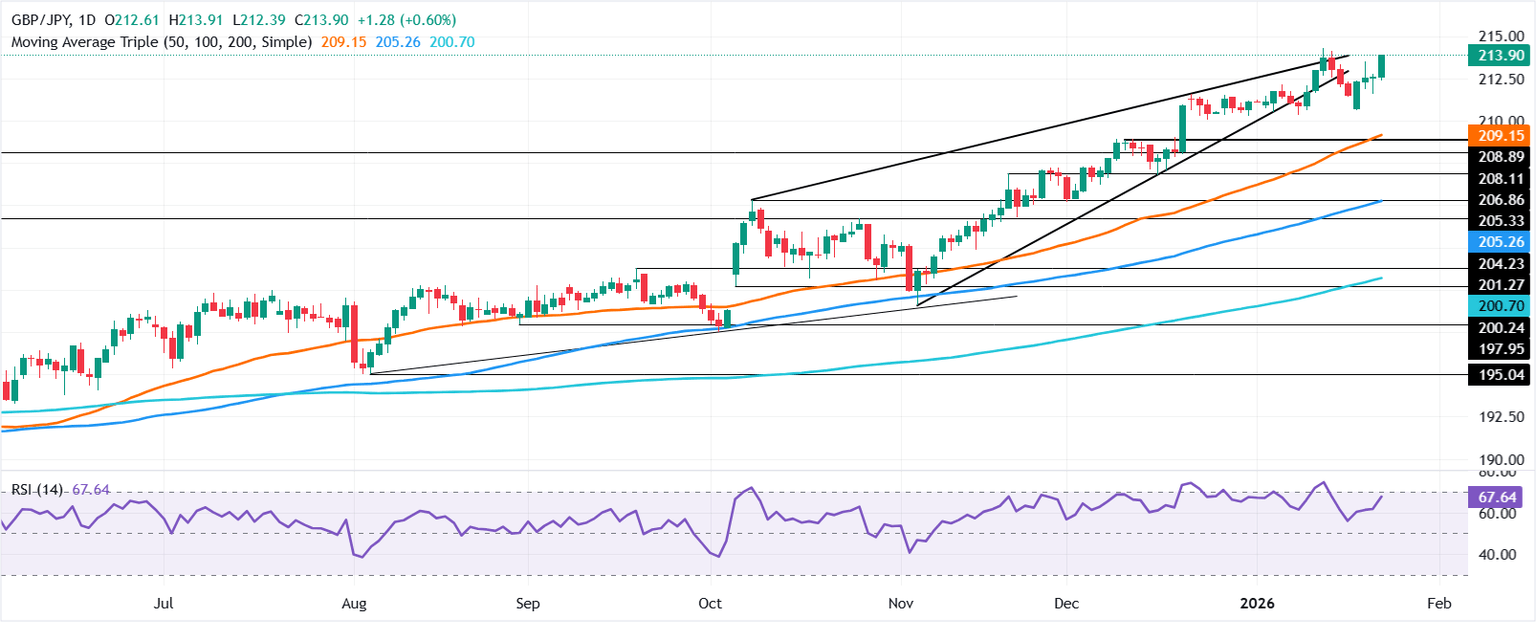 - GBP/JPY hits 213.98, marking a new weekly high amid strong buying momentum.