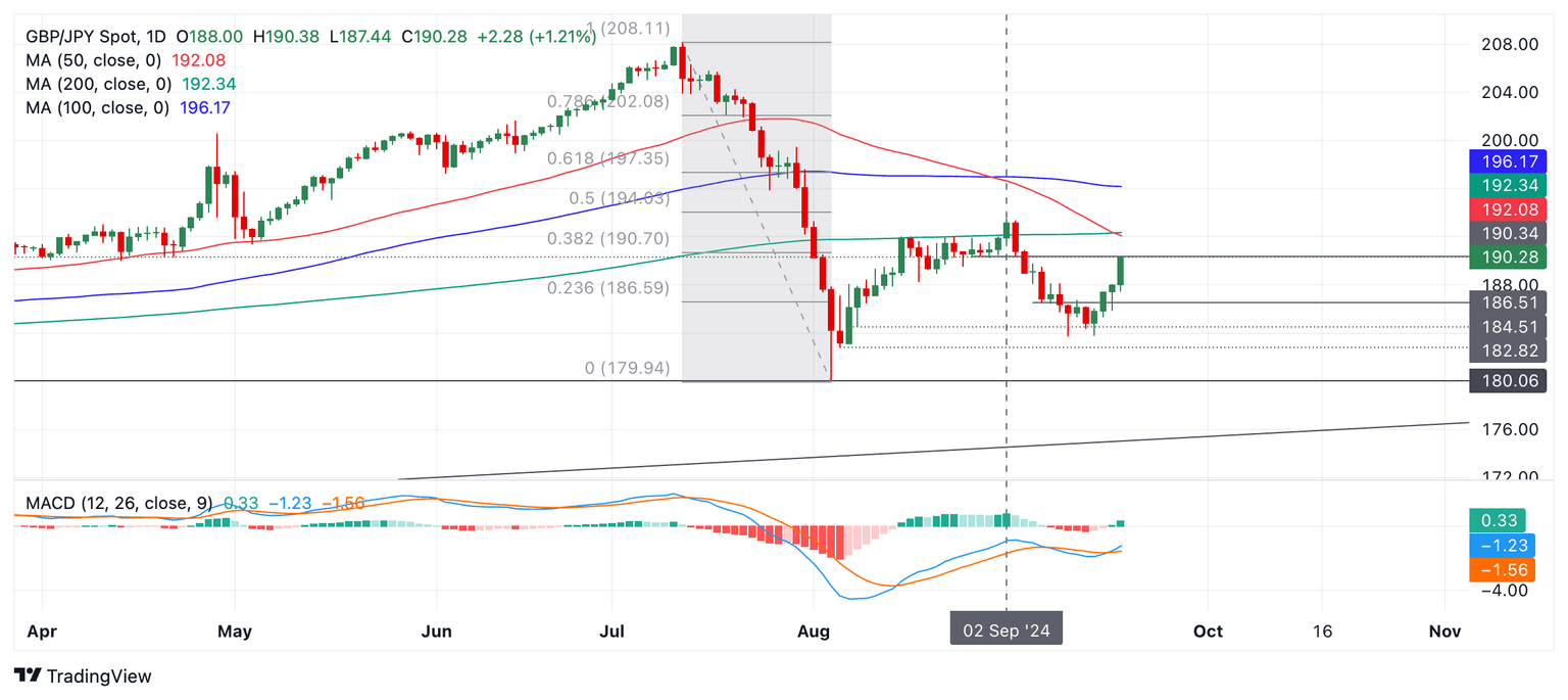 GBP/JPY formed a Hammer candlestick reversal pattern at the September 11 lows and has been pushing higher ever since. It has had an extra left on Thursday following the Bank of England (BoE) interest rate decision.
