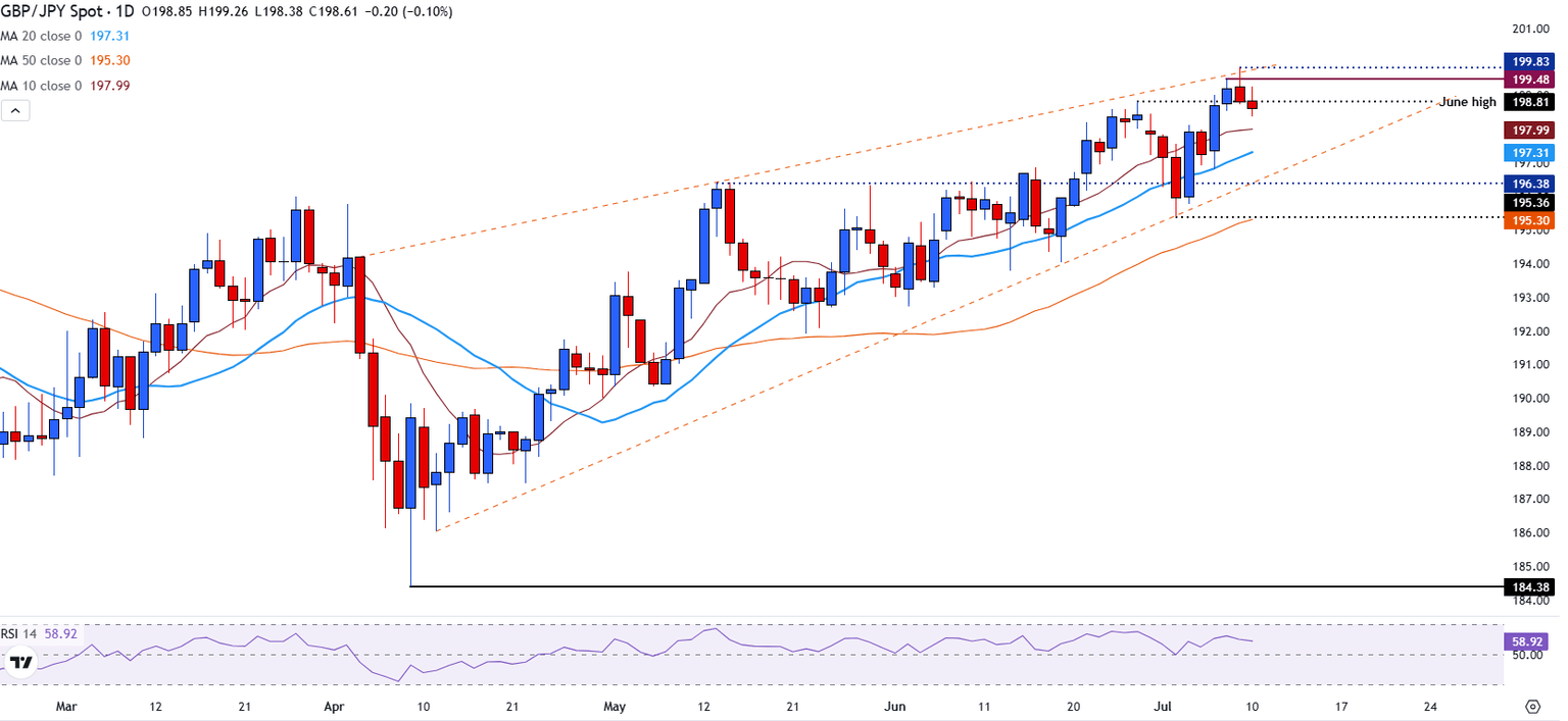 At the time of writing, GBP/JPY is trading just under 198.80 after briefly touching the upper boundary of an ascending channel earlier this week.