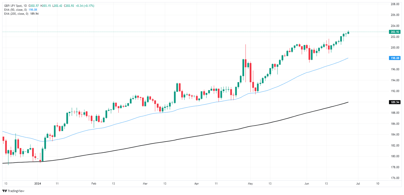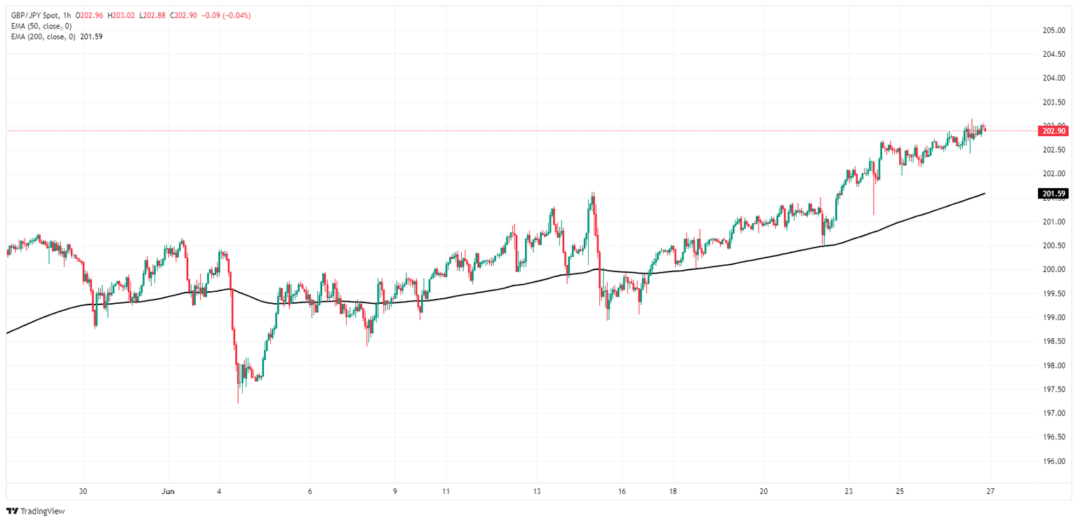 A steady grind into the high side leaves GBP/JPY with little meaningful technical resistance levels. The pair has risen 2% from the last swing low into 198.90, trading steadily north of the 200-hour Exponential Moving Average (EMA) rising into 201.60.
