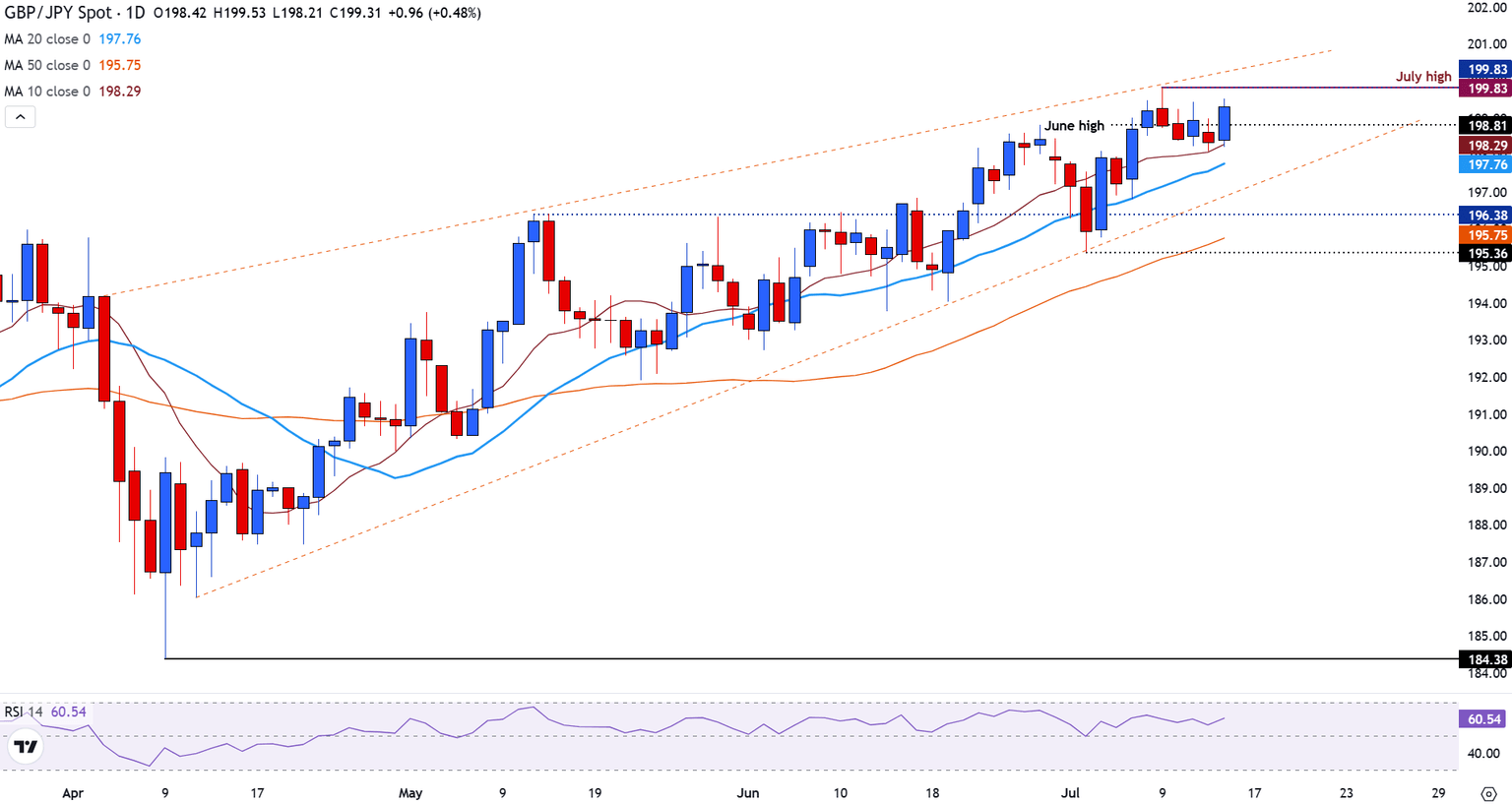 GBP/JPY is rising toward the upper boundary of its ascending channel near 199.80, just above the June high at 198.81, suggesting continued bullish interest.