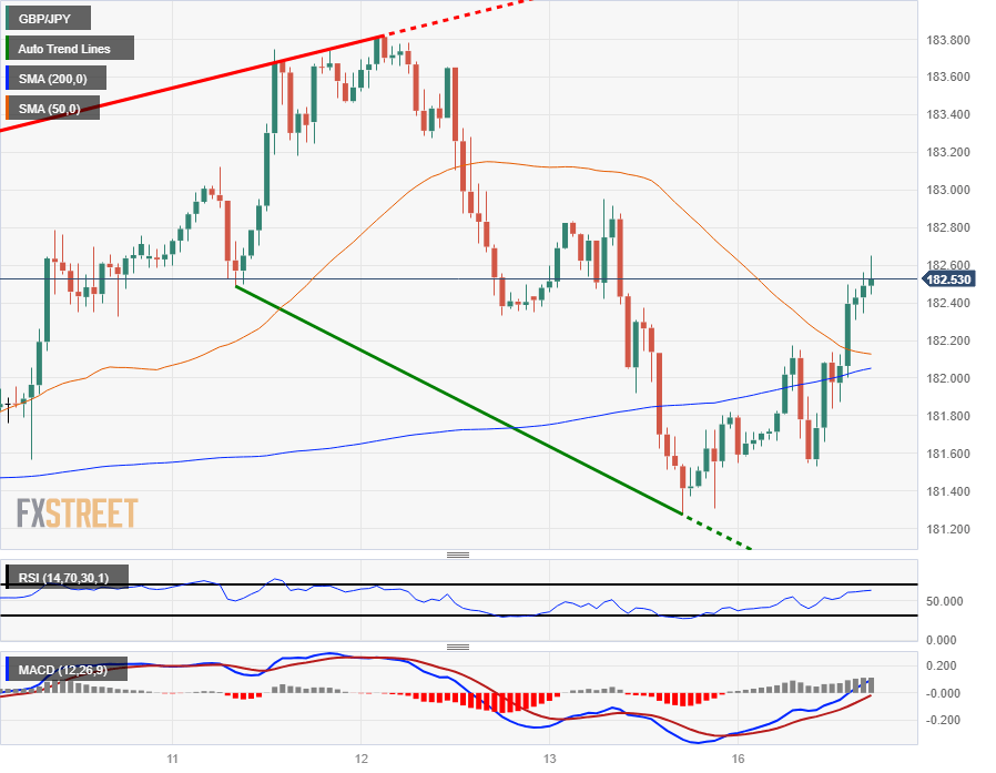 The GBP/JPY is seeing gains for Monday, trading into 182.50 after Friday's dip into 181.27 on broad-market risk aversion. The Pound Sterling (GBP) is catching some early-week lift against the Japanese Yen (JPY) to kick off the new trading week as Guppy traders brace for a tense showing on the economic calendar this week.