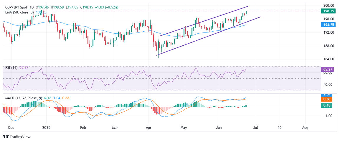 At the time of writing, GBP/JPY is trading near its year-to-date highs around the 198.35 mark during the late American session. That said, the Yen is broadly weaker across the board, weighed down by the Bank of Japan’s latest Summary of Opinions, which reflected a cautious stance on further policy tightening. The central bank's reluctance to commit to a clear rate hike timeline — despite signs of sticky inflation — has reinforced the policy divergence narrative, keeping the Yen on the defensive.