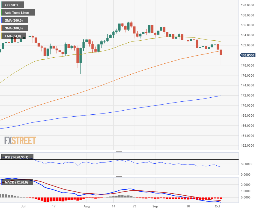 The peak-to-trough price range on the Guppy is over 1.8% on Tuesday, and the GBP/JPY is strung out at the 180.00 major handle after retracing over 50% of the rumored intervention drop.