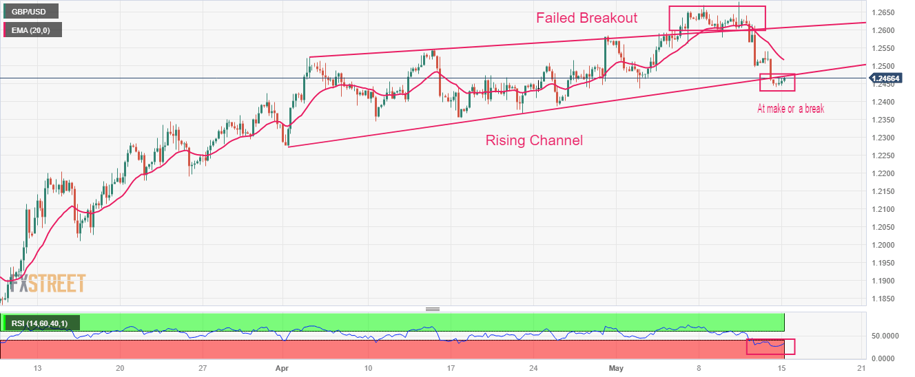 GBP/USD has slipped below the Rising Channel chart pattern formed on a four-hour scale. The Cable is at a make or a break level, therefore, sheer volatility is widely anticipated. The 20-period Exponential Moving Average (EMA) at 1.2516 has acted as a major barricade for the Pound Sterling bulls.