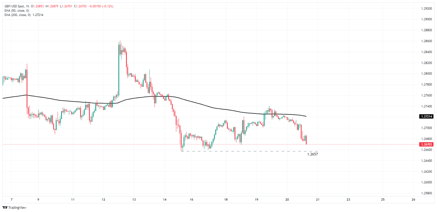 The Pound Sterling fell back below the 1.2700 handle against the US Dollar on Thursday, shedding weight and turning lower in a race back to near-term lows at 1.2657. Technicals favor a bearish extension as price action flubs the 200-hour Exponential Moving Average (EMA) at 1.2721, with further declines on the cards if a bullish rebound isn’t scraped together.