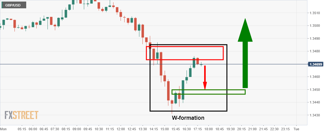 GBP/USD has started out the week on the backfoot. The pair is currently down some 0.44% but off the lows of the day located at 1.3430. The price has recovered to near 1.3470 after falling from 1.3535 earlier on the day.