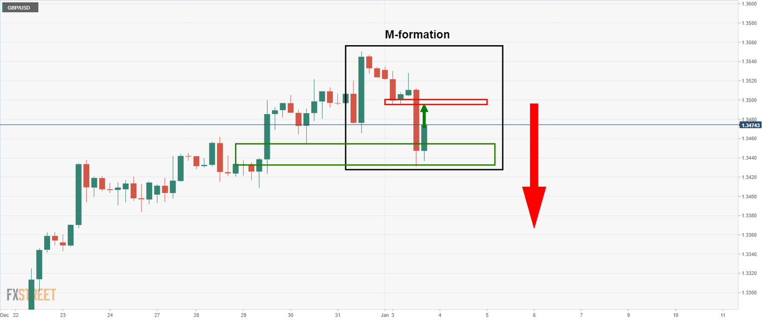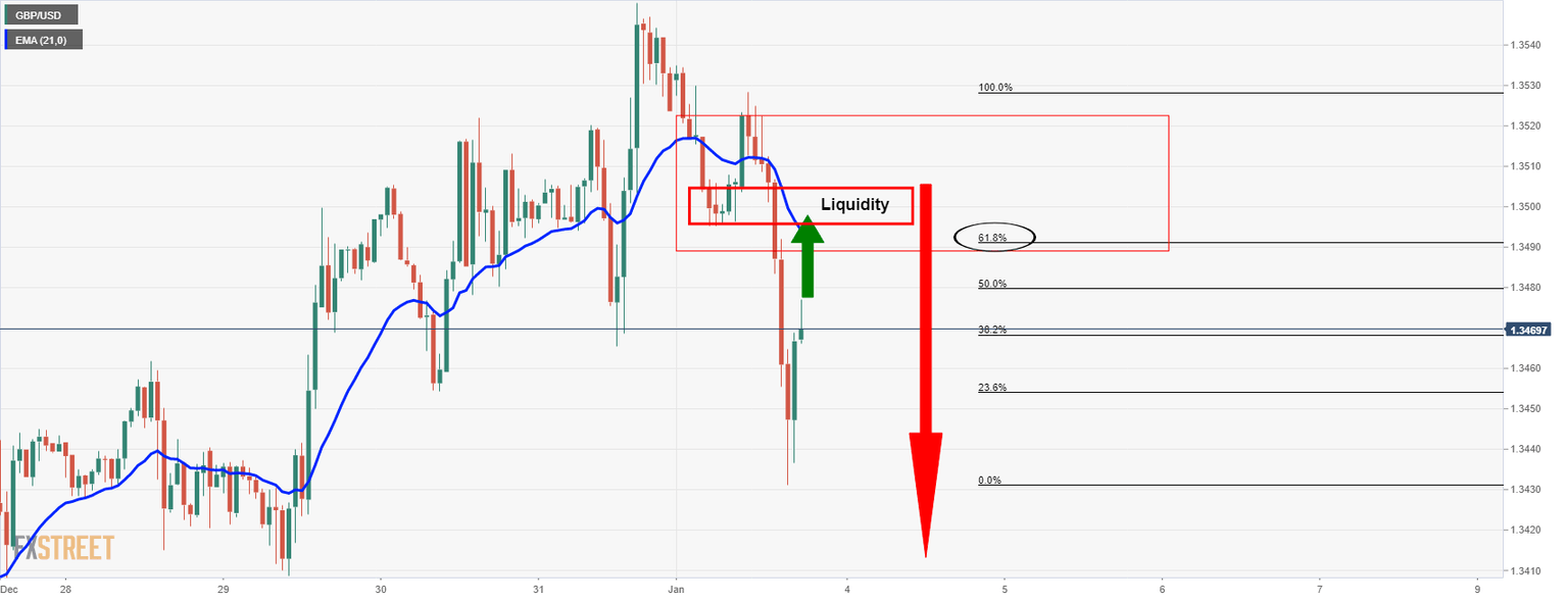 The hourly chart's bearish impulse could be where the trade is. The bears will be keen to see a discount from this juncture into the liquidity zone around 1.35 the figure. A discount will be on the table for a downside continuation towards a test of 1.34 the figure.