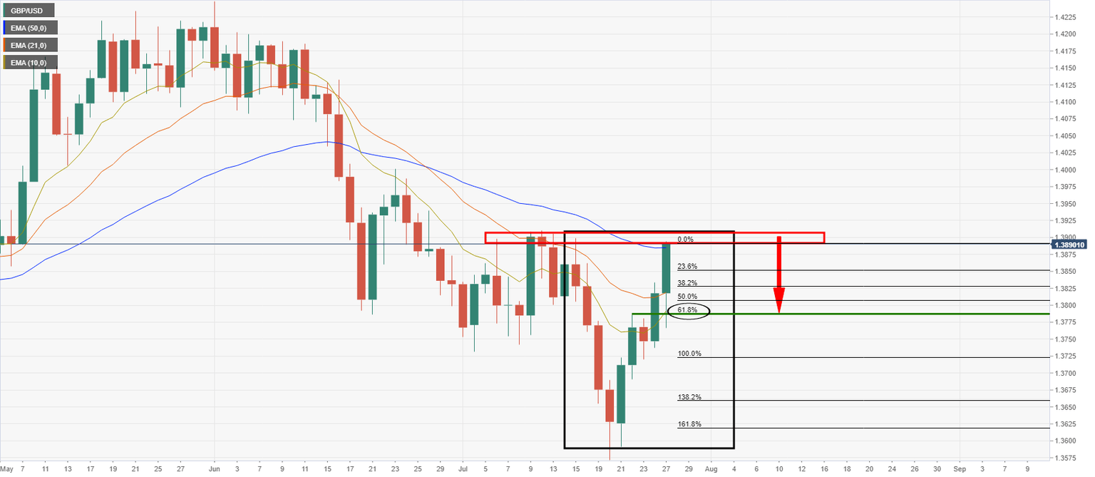 First of all, the bears will need to get beyond the 21-day EMA's confluence with the 38.2% (1.3820's) and then the 50% (1.3807) mean-reversion level.